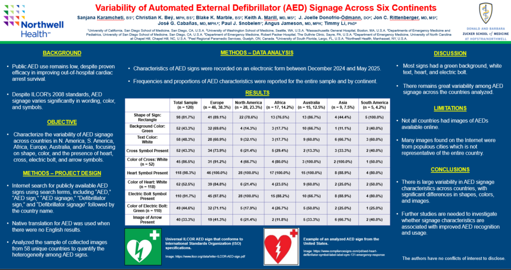 Karamcheti, S., Beÿ, C. K., Marble, B. K., Marill, K. A., Donofrio-Ödmann, J. J., Rittenberger, J. C., Cabañas, J. G., Snobelen, P. J., Jameson, A., & Li, T. (2025, November 8–9). Variability of automated external defibrillator (AED) signage across six continents [Poster presentation]. Resuscitation Science Symposium (ReSS) 2025, American Heart Association, Ernest N. Morial Convention Center, New Orleans, LA